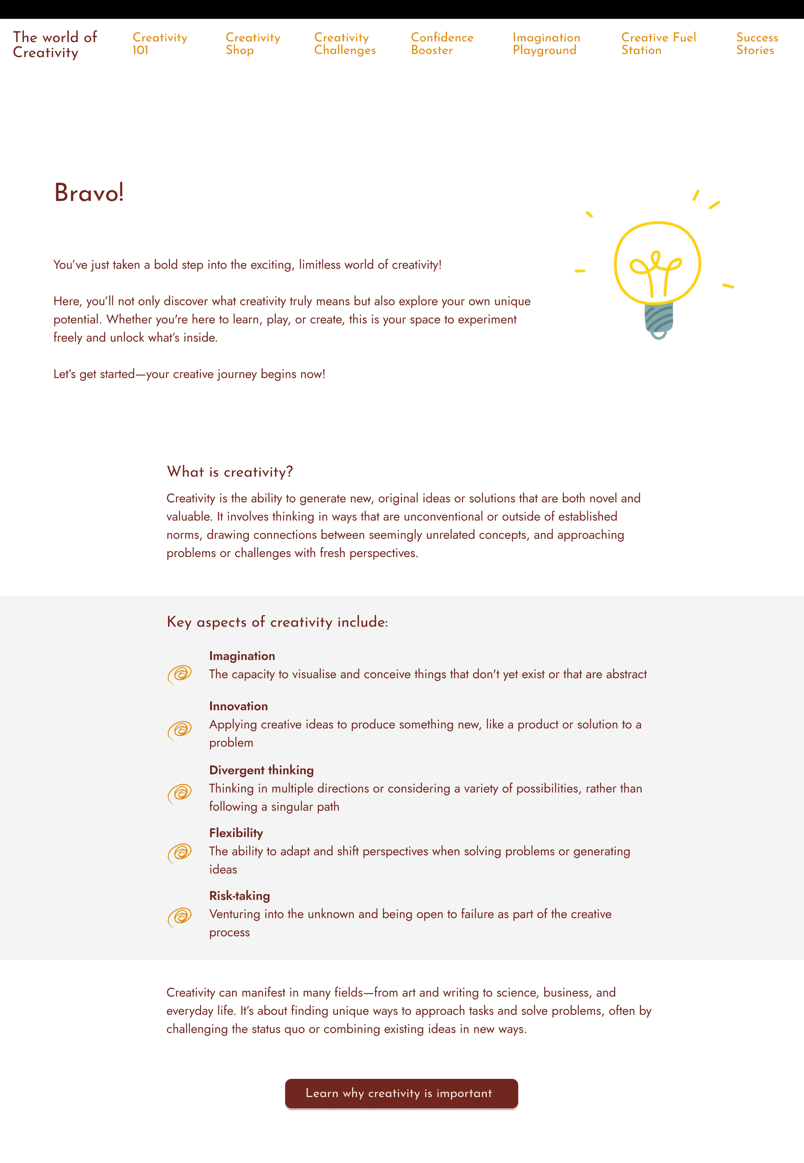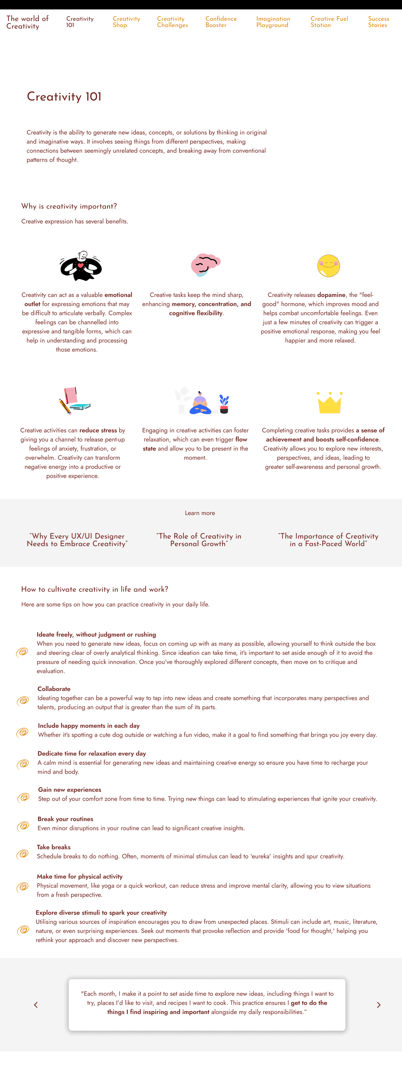 I designed a website called The world of Creativity. Here, the visitor could learn what creativity means, "buy" creativity, read success stories about how others have found their creative side, and so on. I made an interactive prototype in Figma and filmed a 5-minute video where I explained my personal story with creativity in a bit more detail as I walked through the prototype.