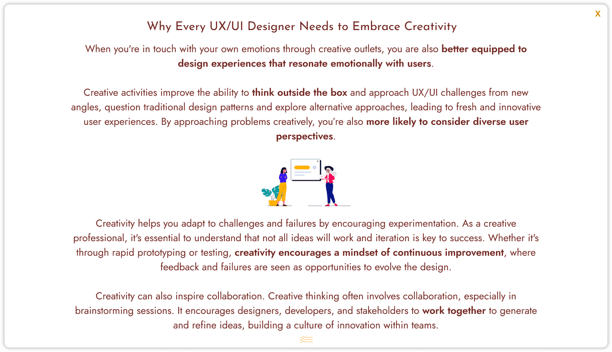 This project gave me the opportunity to explore creativity both as a UX concept and as a personal skill. Working without strict guidelines allowed me to experiment more freely, push my own boundaries, and think beyond conventional solutions.