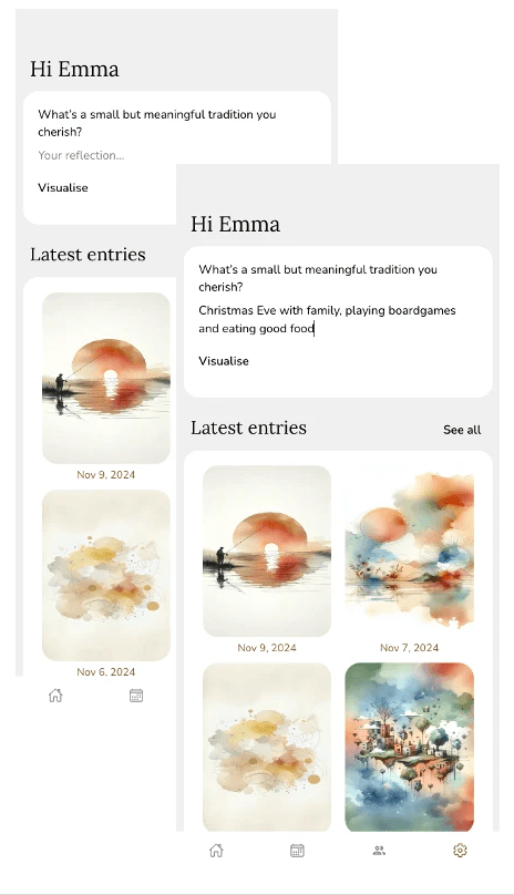 This project was driven by a desire to support mental well-being through design. It explores how digital experiences can encourage self-reflection, mindfulness, and self-awareness, drawing inspiration from principles of art therapy.