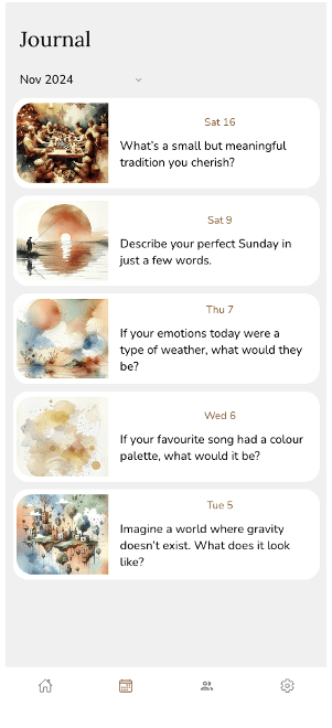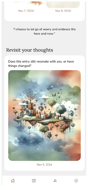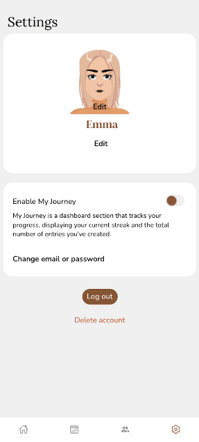 I conducted in-person usability testing with two participants (one female, one male), both around 30 years old. The sessions focused on key interactions such as responding to daily prompts, navigating journal entries, and using tracking features.