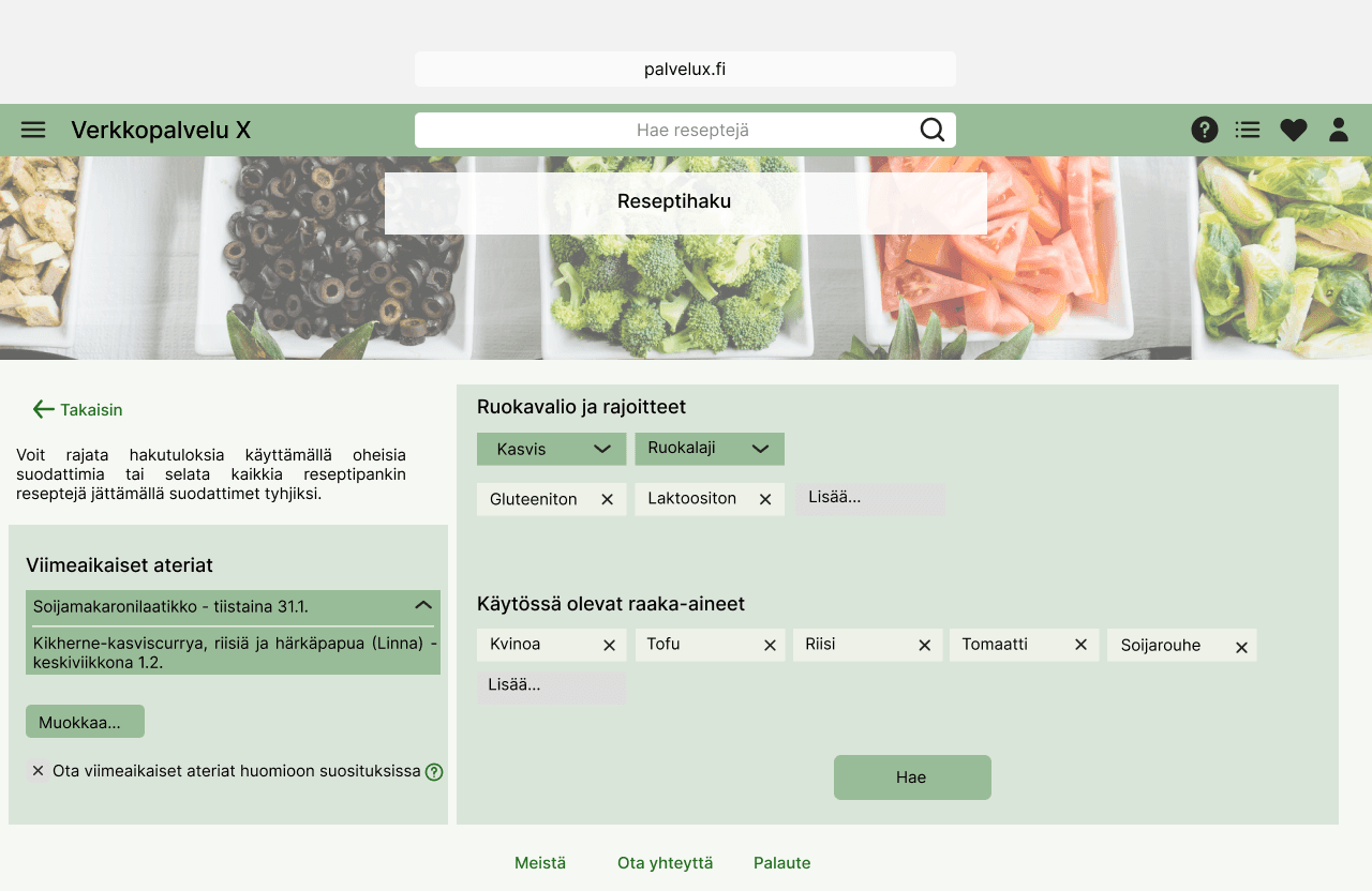 We designed a web service that helps users plan their weekly meals based on the ingredients they already have at home. Users can search for recipes, create a weekly meal plan, and add missing ingredients directly to a shopping list.
