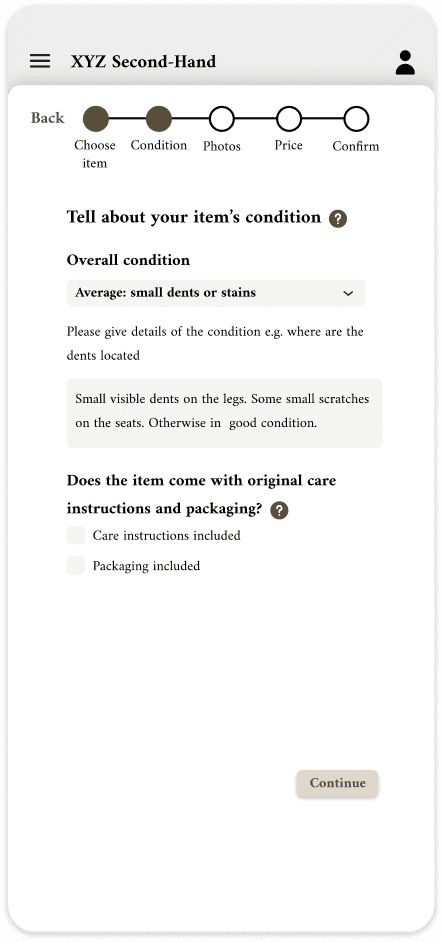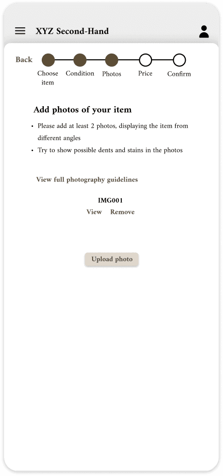 The aim was to create a user interface that demonstrates how a seller can list an item on XYZ’s new second-hand store using a mobile device. While designing the user interface, three key questions were considered: