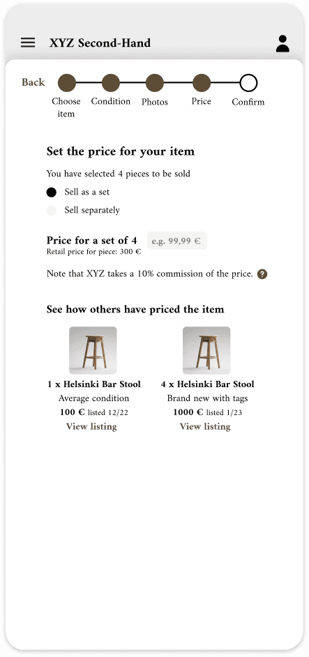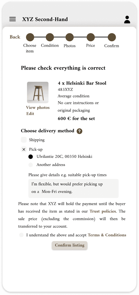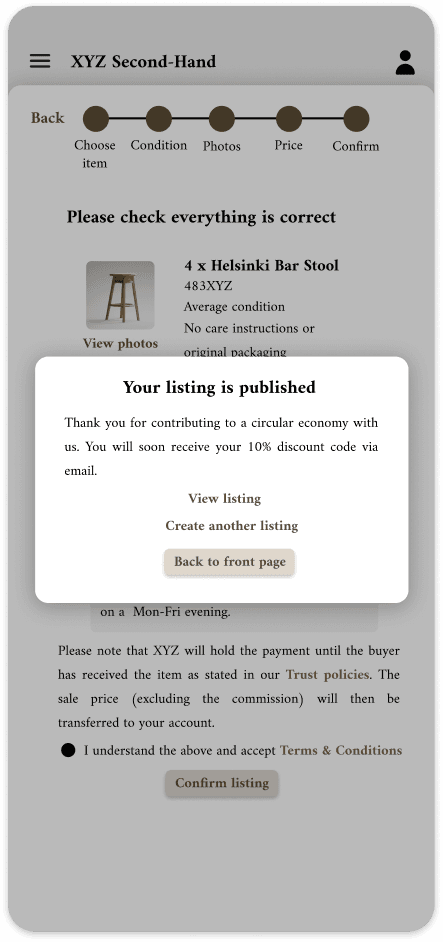 The final design focuses on usability and lowering barriers to entry for sellers by making the listing process quick, clear, and accessible. Trust-building elements and transparent communication address common concerns around second-hand transactions. Together, these decisions support increased engagement and create a cohesive experience aligned with XYZ’s brand and sustainability objectives.